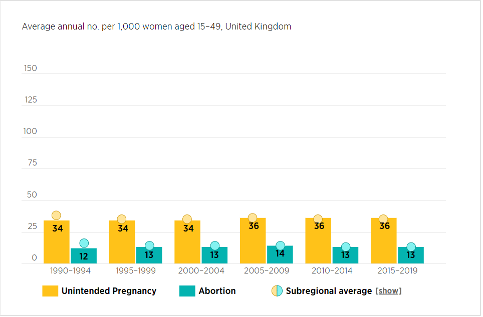 The graph above is for the UK and shows that, over a 29-year period, an average of 35% of pregnancies were unintended and, of those, an average of 13% end in abortion. The Institute doesn’t provide figures until its graph for 2015-2019 where it stated that there were 1,150,000 pregnancies annually. That must be an average but they don’t state it so I’ll take them at their word. In that four-year period, 545,000 were unintended and 197,000 ended in abortion. Again, they don’t state but this must also be annually.