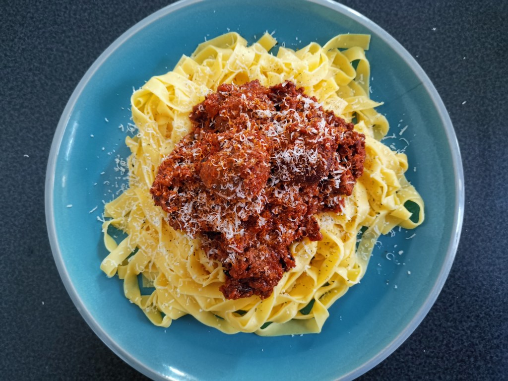 I’ve found pappardelle pasta works really well with this. It’s broad, flat and has a thick, dense texture. The ragu coats it beautifully. If you can’t get your hands on pappardele, tagliatelle or linguine will do. For my most recent batch, I had to make do with fresh tagliatelle. Not exactly a hardship.